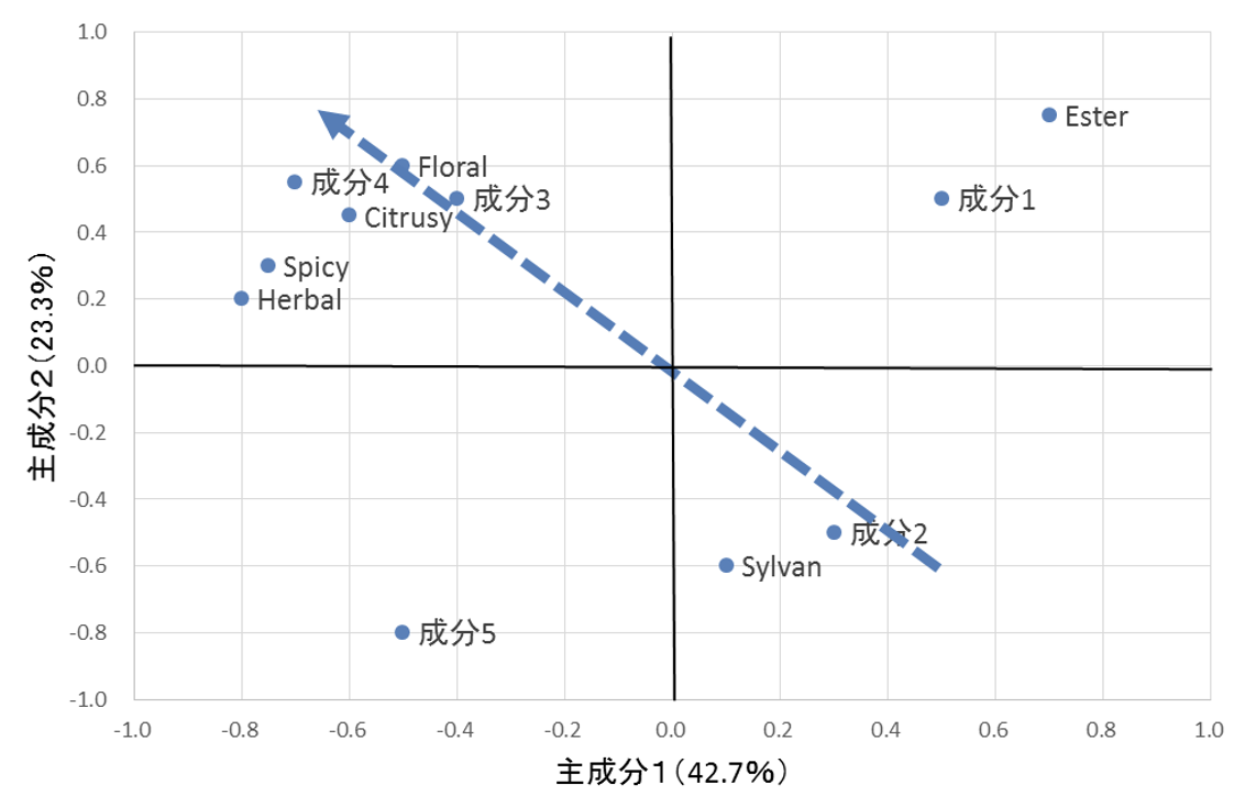 このような解析には、一般的に主成分分析や PLS 回帰分析といった多変量解析が用いられます(尾崎・鰐川 2008)。これらは多数のデータから要約的な情報を抽出する手法です。官能評価の結果は「フローラル:強度 3」「ハーバル:5」「苦味:3」「後苦味:2」といった香りや味の質と強度のデータで表現されます。一方、成分分析データは「linalool:20 ppb」「β-eudesmol:10 ppb」といった定量値として与えられます。フローラルの強弱に関連する成分を探すには、フローラルの強弱と挙動が連動する成分を見つければよいわけです。