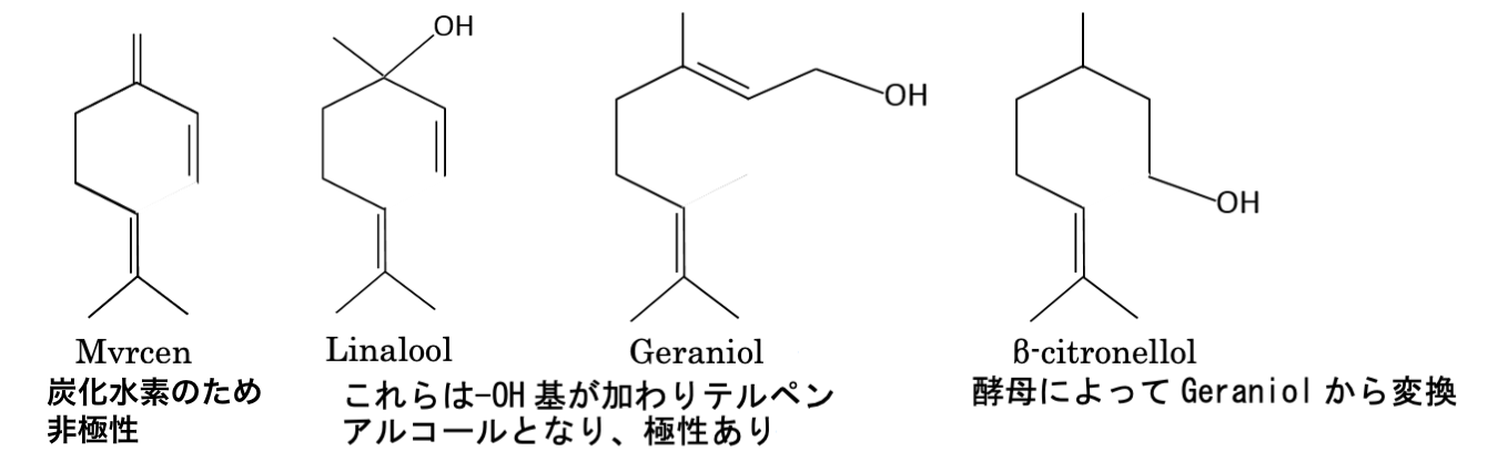 これらの精油成分(以降「香気成分」とも呼びます)のいくつかは、酵母によって劇的に変化します。ここからは、その「変換と吸着」をキーワードに説明していきます。