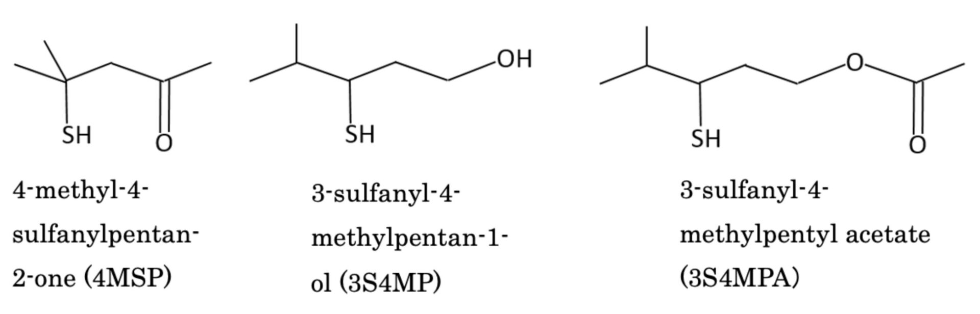 含硫成分のうち、4-methyl-4-sulfanylpentan-2-one(4MSP)、3-sulfanylhexan-1-ol(3SH)、3-sulfanyl-4-methylpentan-1-ol(3S4MP)は、発酵前には単独で存在せず、前駆体に結合した形から酵母の酵素によって遊離し、香気活性が現れると推定されています(蛸井 2018)。このうち 4MSP と 3SH はワインにも共通する成分であり、3S4MP はニュージーランドで生まれたホップ品種 Nelson Sauvin で初めて確認されました(蛸井 2018)。この品種を用いたビールは、白ワイン様やマスカット様の香りを呈します。