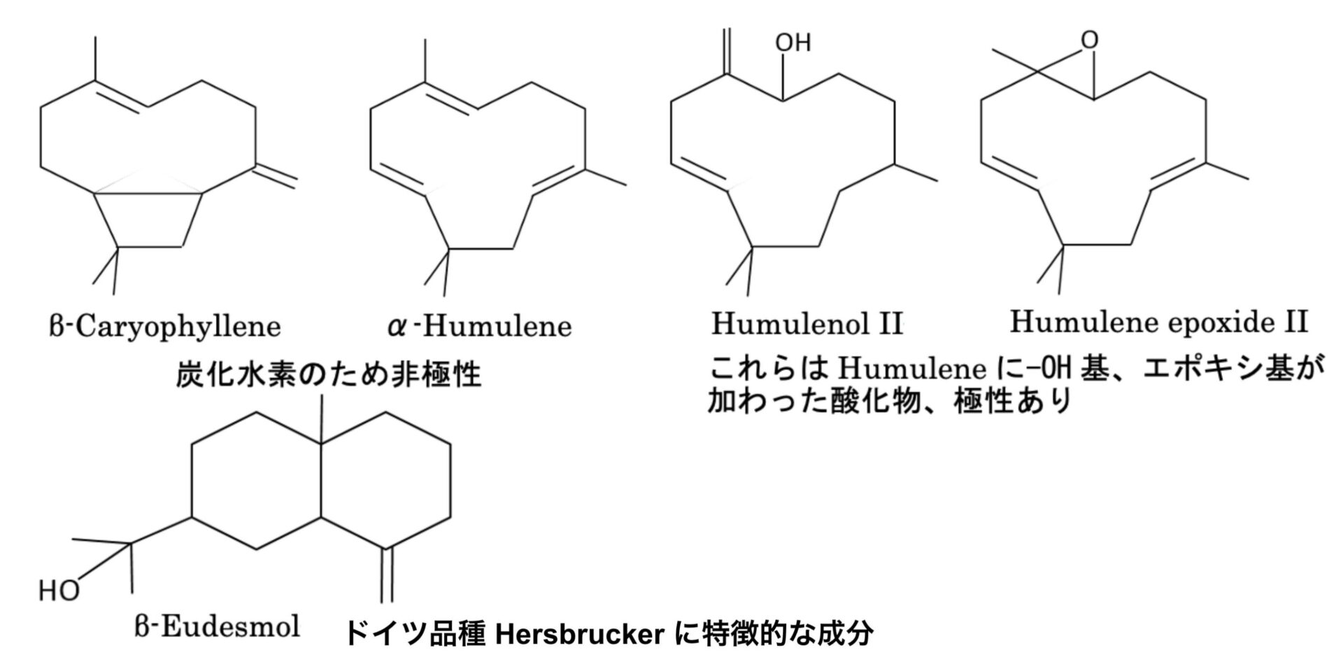 酵母によって変化する成分の代表例を説明しましたが、ホップからビールへ直接付与される成分も多数存在します。極性を持ち水に溶けやすいモノテルペン酸化物やセスキテルペン酸化物です。具体的には、linalool、humulene epoxides、humulol、humulenolⅡ、terpineols、nerolidol、eudesmols、cadinols などが挙げられます(小原・村上 2015)。これに加えて、酵母によって変換された成分も寄与し、多数かつ多様な世界を形成します。