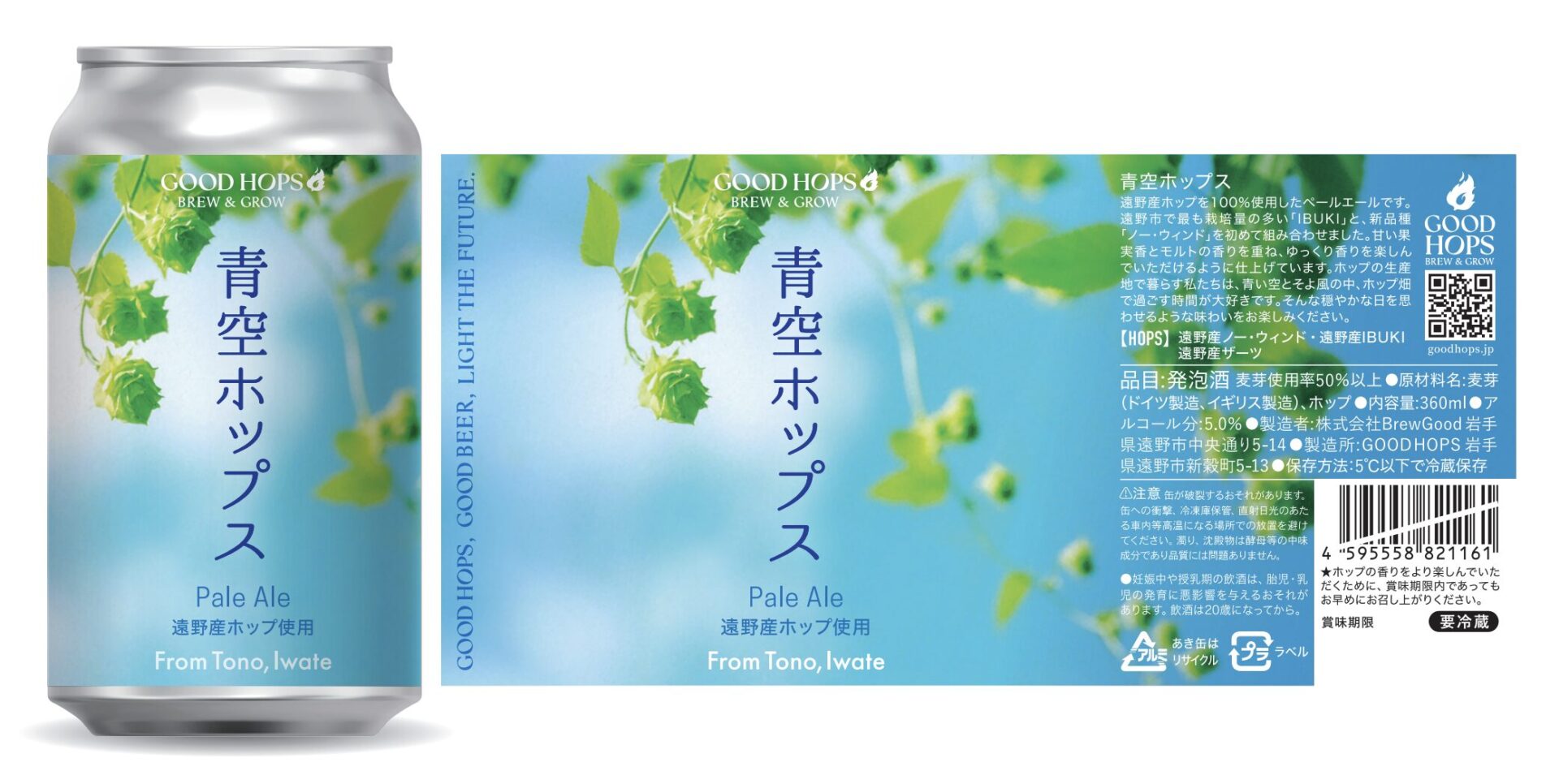 遠野産ホップを100%使用したペールエールです。遠野市で最も栽培量の多い「IBUKI」と、新品種「ノー・ウィンド」を初めて組み合わせました。甘い果実香とモルトの香りを重ね、ゆっくり香りを楽しんでいただけるように仕上げています。ホップの生産地で暮らす私たちは、青い空とそよ風の中、ホップ畑で過ごす時間が大好きです。そんな穏やかな日を思わせるような味わいをお楽しみください。
